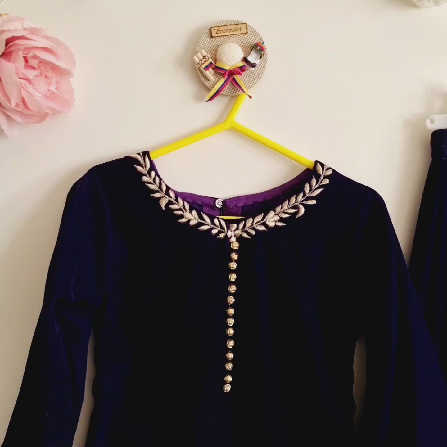 Beautifully handmade Velvet Kameez Pajama featuring Gold Tilla work on Neckline, Sleeves and Trouser.