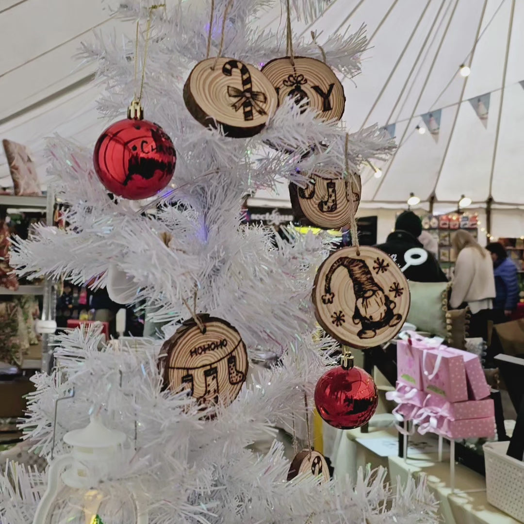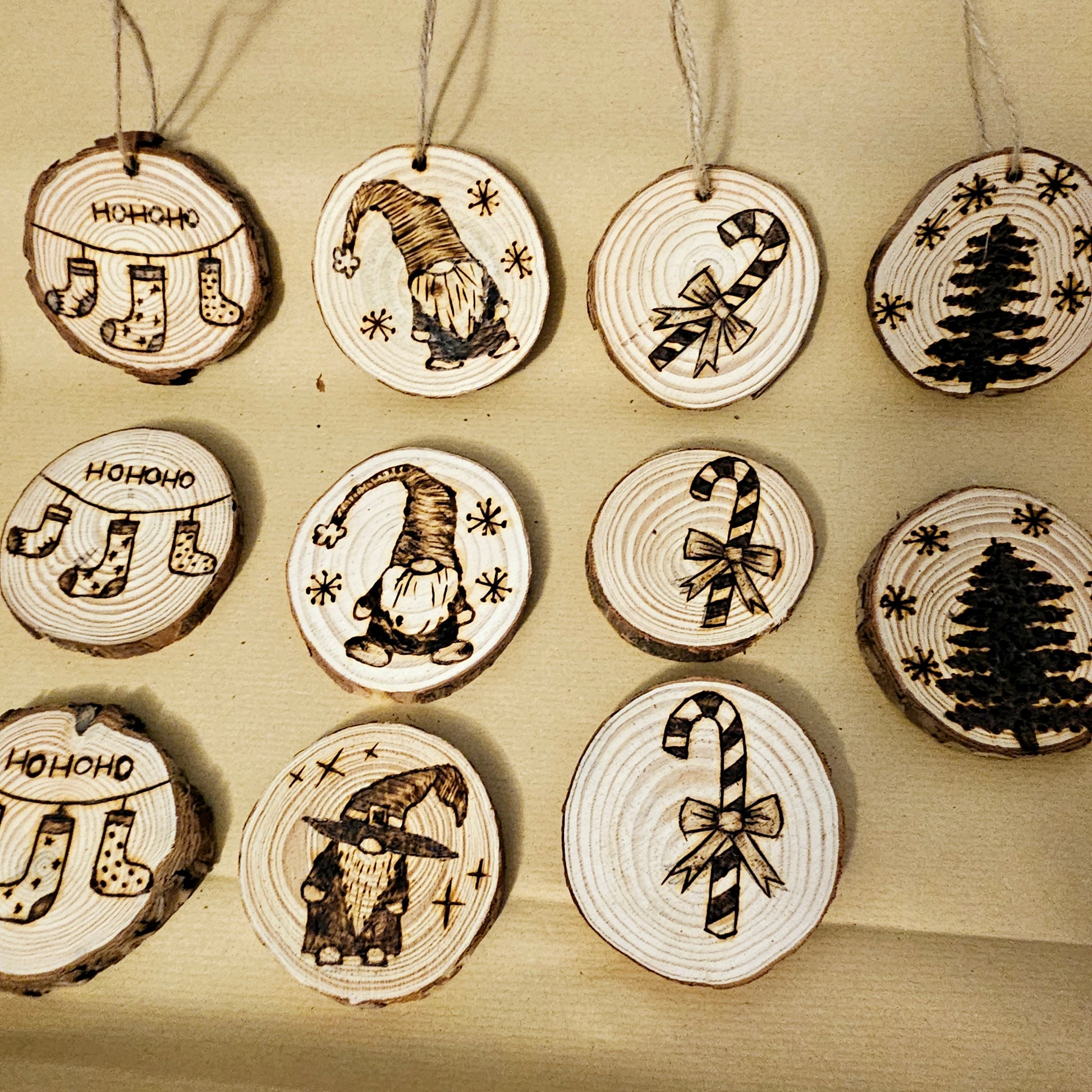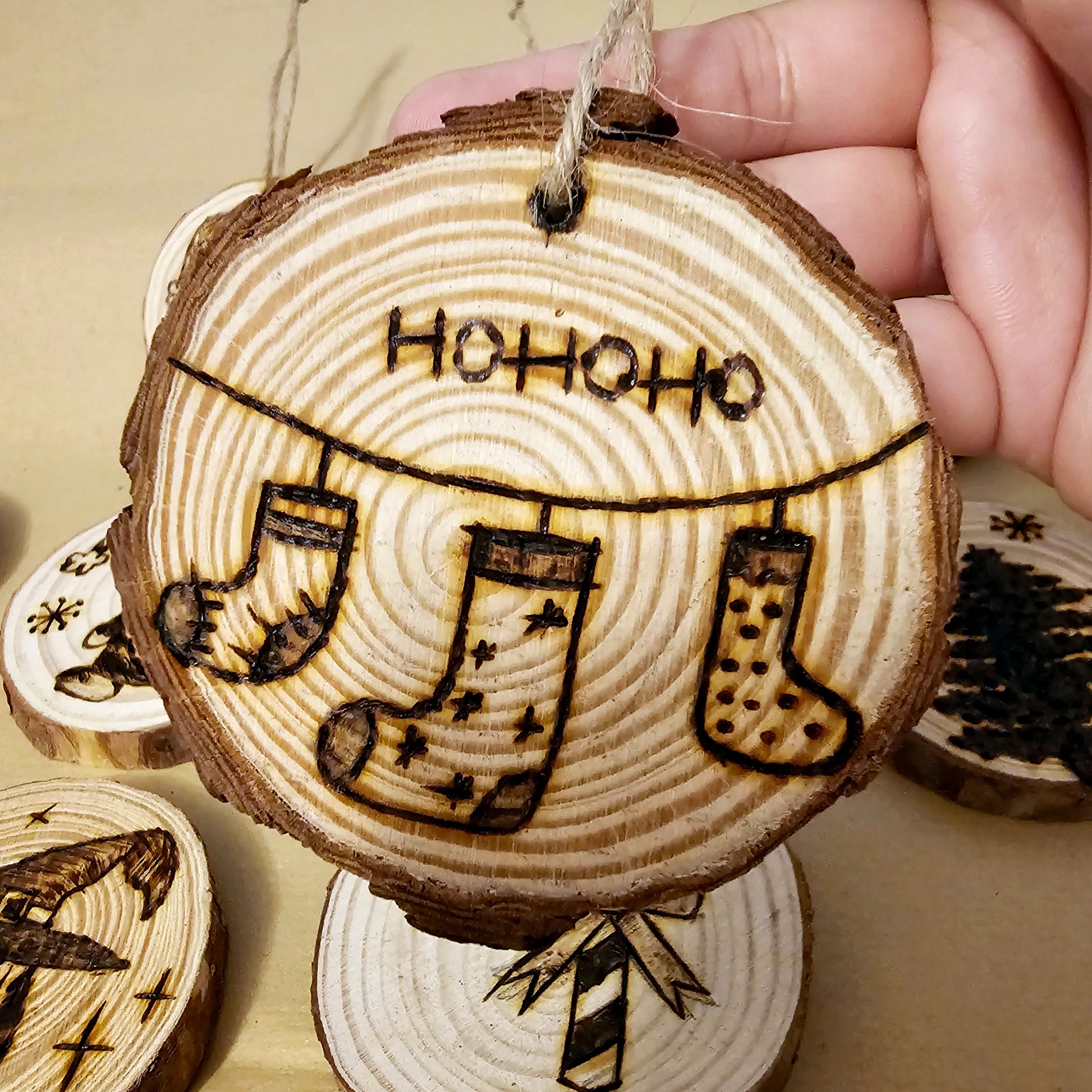 This rustic, lightweight wood slice Christmas ornament has a illustration engraved on the front. The perfect tree ornament or gift for any loved ones.