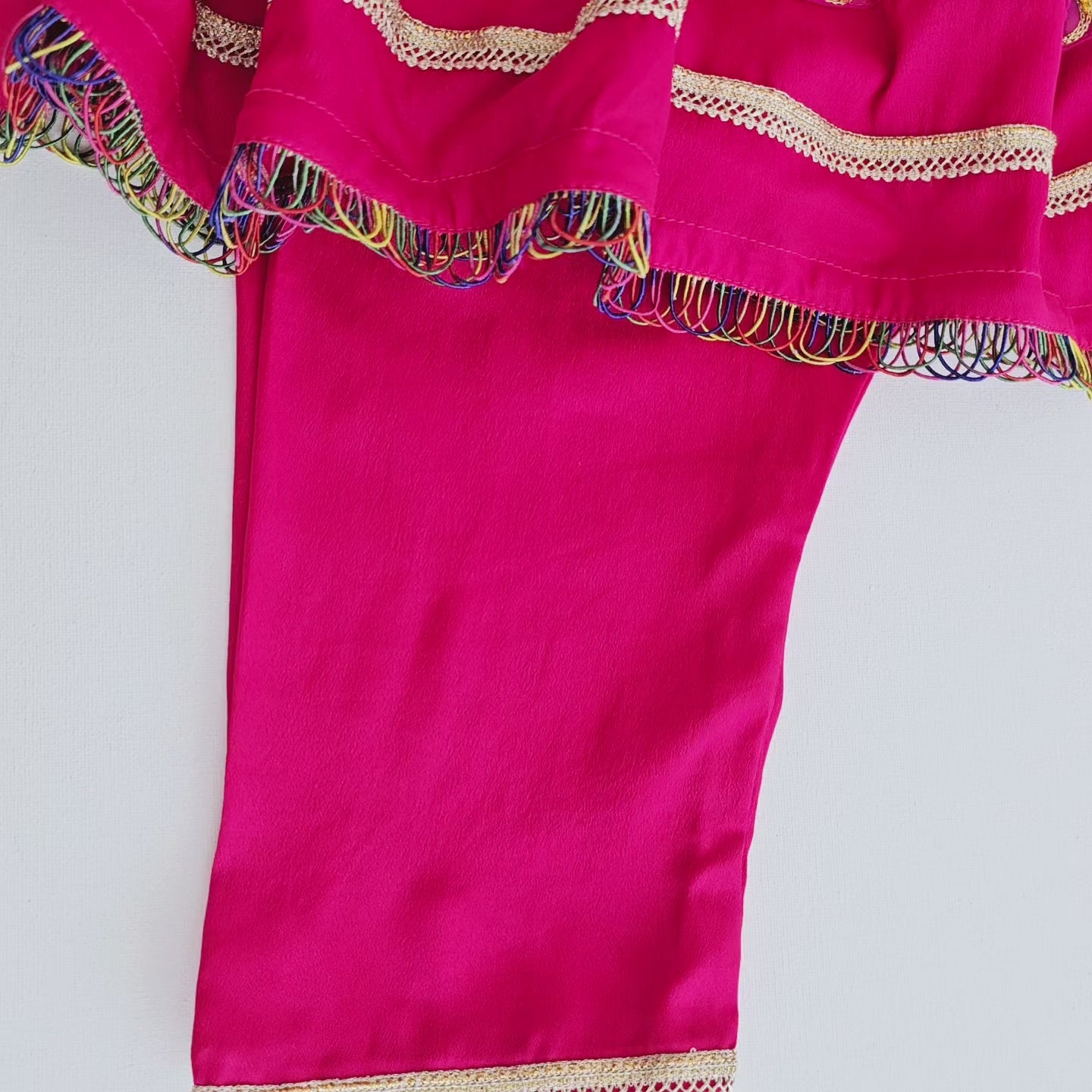 Beautiful Shocking Pink Frock Indian Pakistani Dress Silk Chiffon Frock and Trouser Embellished with Rainbow Trim Lace and Copper Work Shirt with Copper Net Dupatta Specially Designed by THE COMFORT CLOTHING.