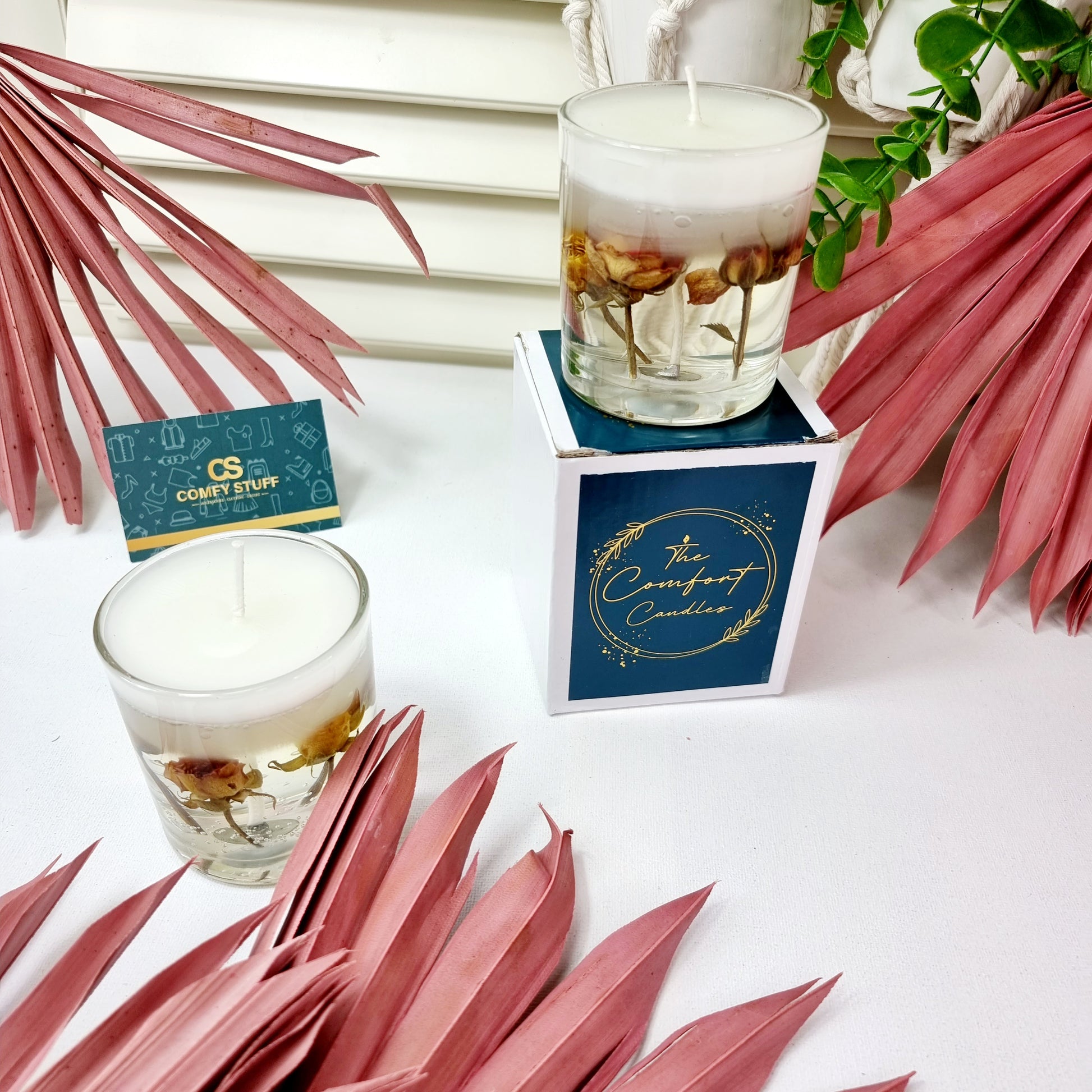 A creative candle for display within your home. Colorful dry flowers suspended in a clear gelatine wax candle glass.