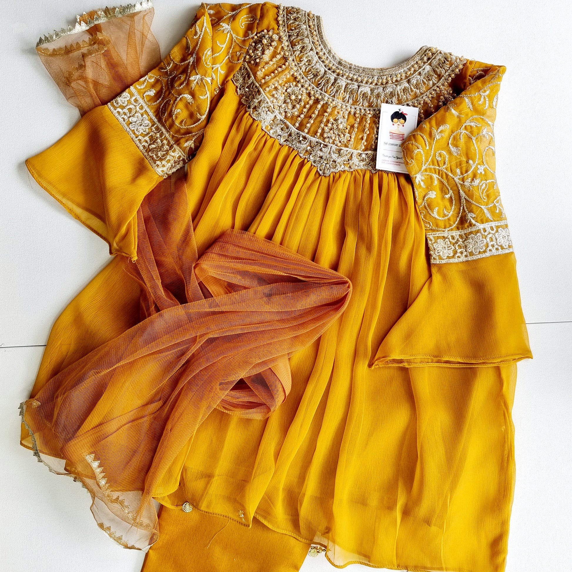 Beautiful Pakistani Dress Mustard Chiffon Frock Embellished with Tilla-work and Polyester Trouser with Net Trim Lace Dupatta Specially Designed by THE COMFORT CLOTHING.