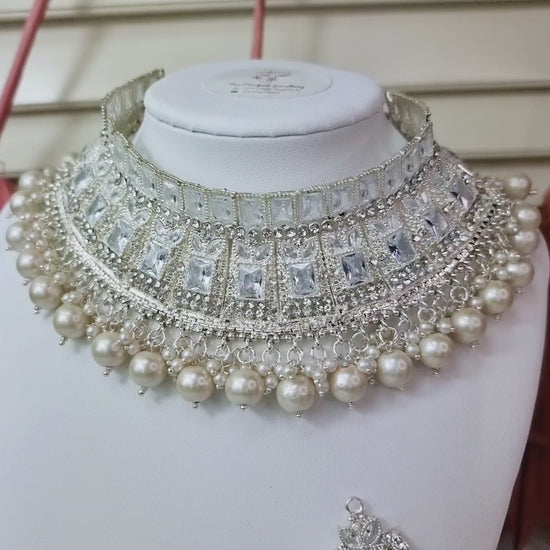 New Style Heavy Collar Bridal Jewellery set available in 4 colours Sea Green, Golden, Silver and Pink/ Green. Embedded with Fresh and Real Stones.