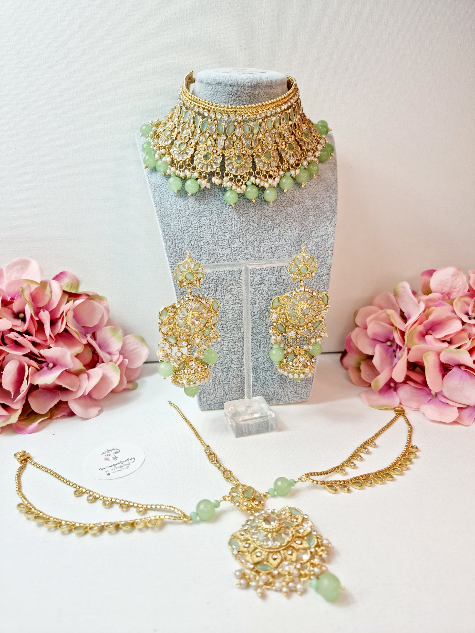 New Style Heavy Collar Bridal Jewellery set available in 4 colours Sea Green, Golden, Silver and Pink/ Green. Embedded with Fresh and Real Stones.