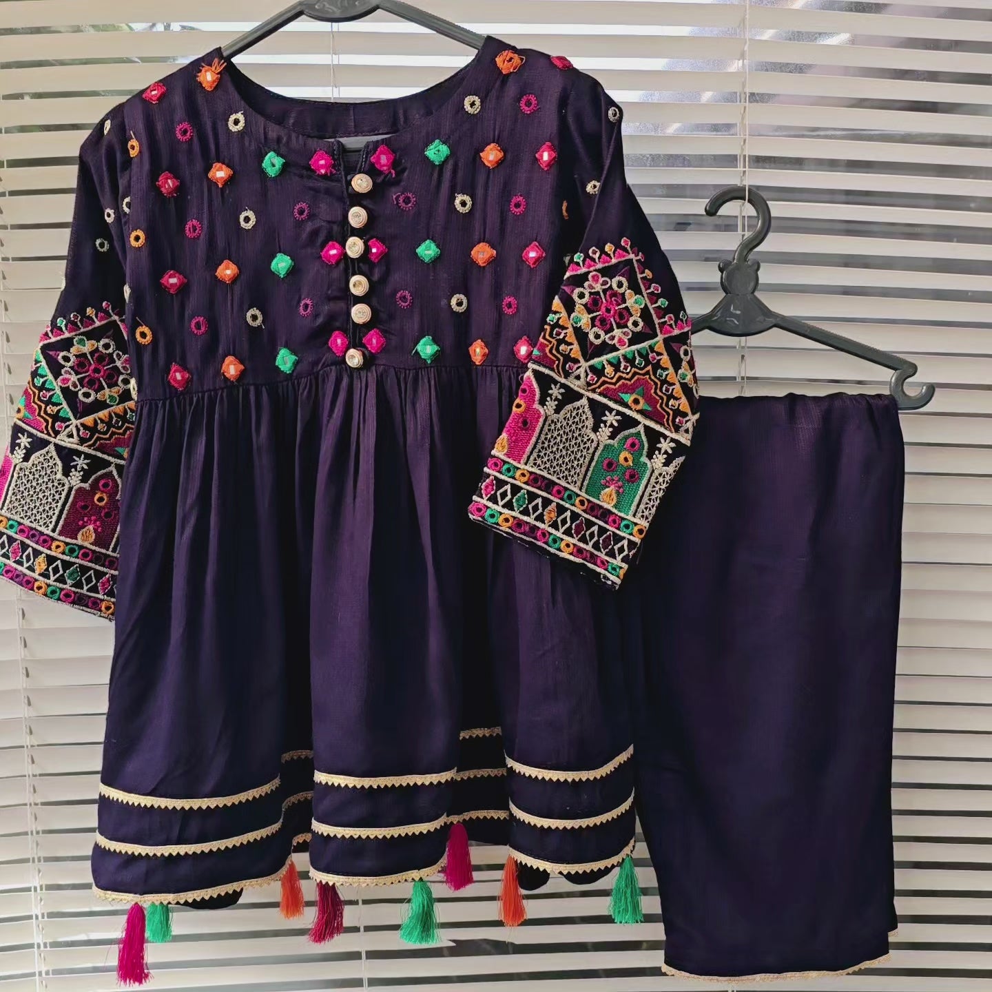 Beautifully handmade Velvet Short Kameez Pajama featuring Gold Tilla work on Neckline, Sleeves and Trouser.
