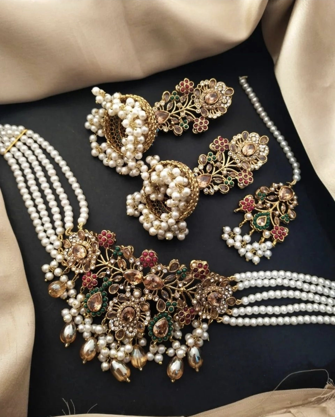 Light Weight Kundan Choker Set with Long Dangled Jhumka and Teeka / Indian Pakistani Asian Bridal Jewelry Set
