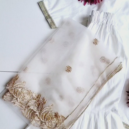 Dupatta (Scarf) : White Net Dupatta with Copper Hand work.