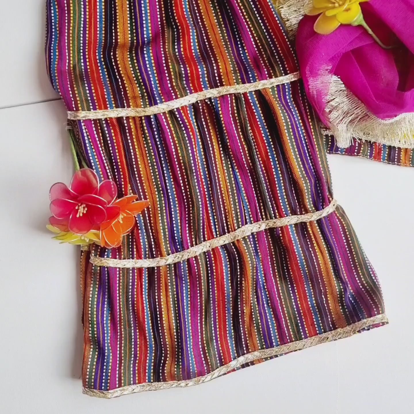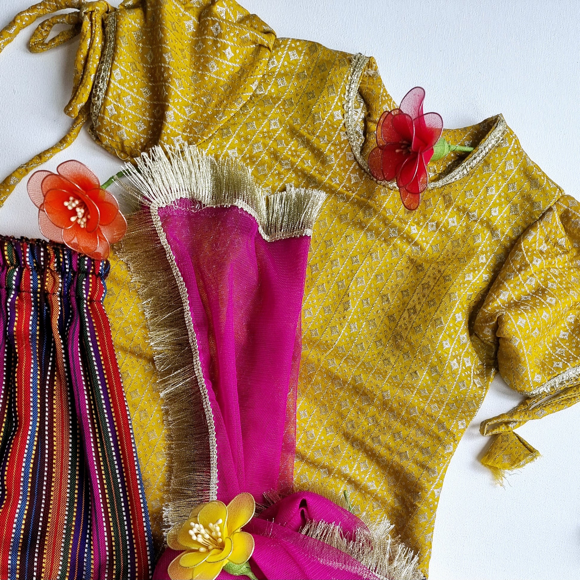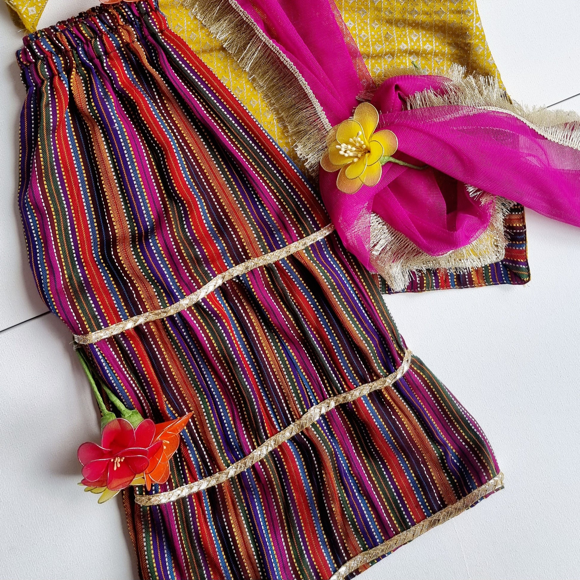 Beautiful Girls Pakistani Dress Jamawar Shirt with Cotton Garara Embellished with Gold Trim Lace Dupatta Shirt with Knot on the Arms Specially Designed by THE COMFORT CLOTHING.