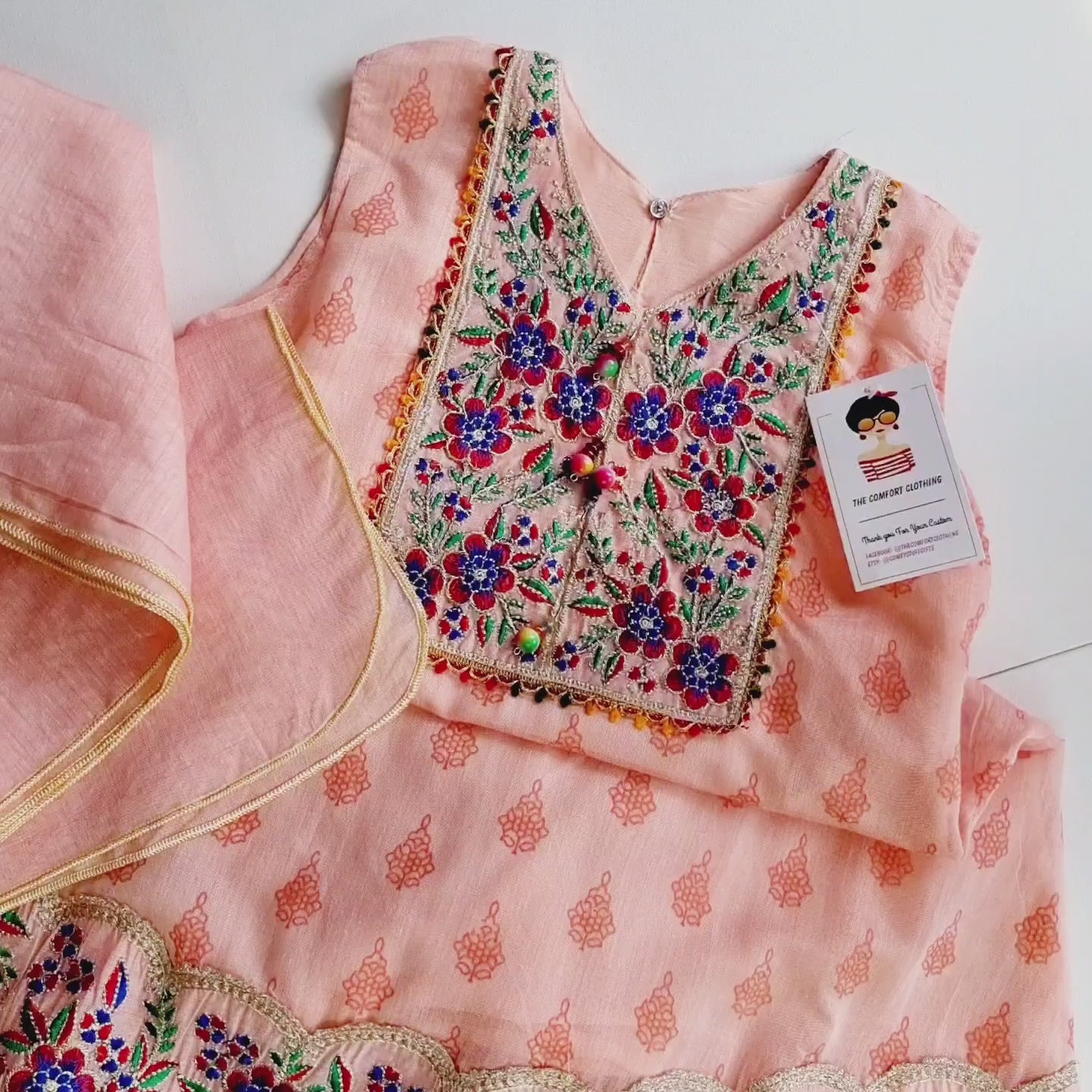 Beautiful Pakistani Dress Pink Lawn Frock Embellished with Thread Work and Lawn Trouser with Lawn Trim Lace Dupatta Specially Designed by THE COMFORT CLOTHING.