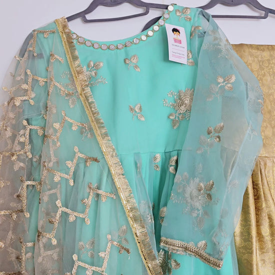 Kameez (Shirt) : Sea Green Net Chiffon Frock with Hand Work
