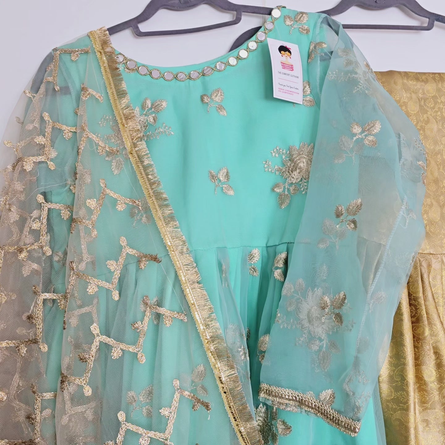 Beautiful Pakistani Dress Sea Green Chiffon Frock Embellished with Copper Trim Lace and Copper Jamawar Sharara with Copper Net Dupatta Specially Designed by THE COMFORT CLOTHING.